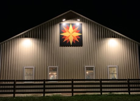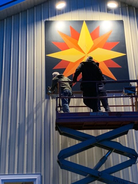 The 8’x8′ Shining Star Barn Quilt required a lift to mount it high on the barn. Look how wonderful it is with spotlights on it.