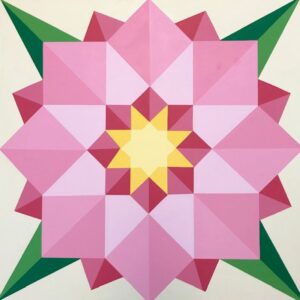 Peony Barn Quilt- You can almost smell the flower. This gorgeous Peony barn quilt is made in 5 shades of pink on a very pale yellow background with two tone green leaves.